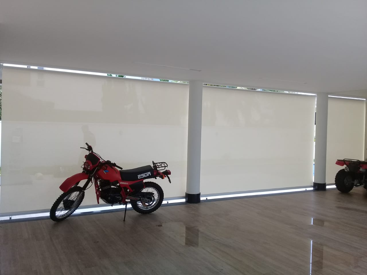 O acionamento pode ser manual, com manivela ou corrente, ou automatizado com motor e controle remoto. Também é possível incluir guias laterais ou cabos de aço para dar mais firmeza contra o vento.